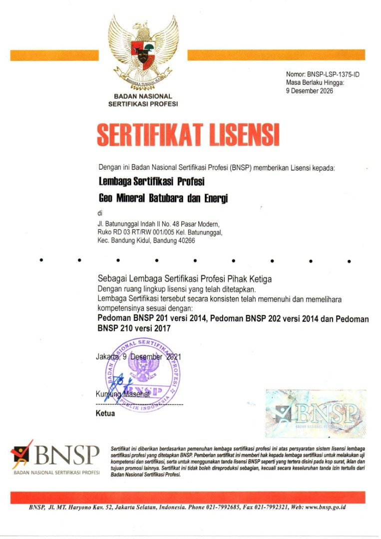 Lembaga Sertifikasi Profesi Geo Mineral Batubara dan Energi adalah lembaga sertifikasi terpercaya yang telah mendapatkan lisensi resmi dari Badan Nasional Sertifikasi Profesi (BNSP) dengan No.1375-ID. Didirikan pada 17 Oktober 2018, LSP GMBE hadir sebagai garda terdepan dalam memastikan kompetensi profesional di bidang geo-mineral, batubara, dan energi.